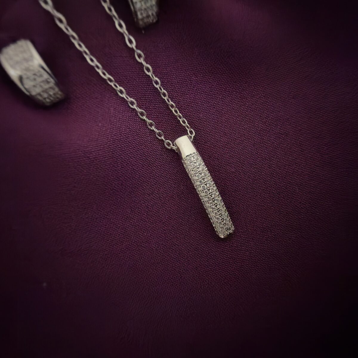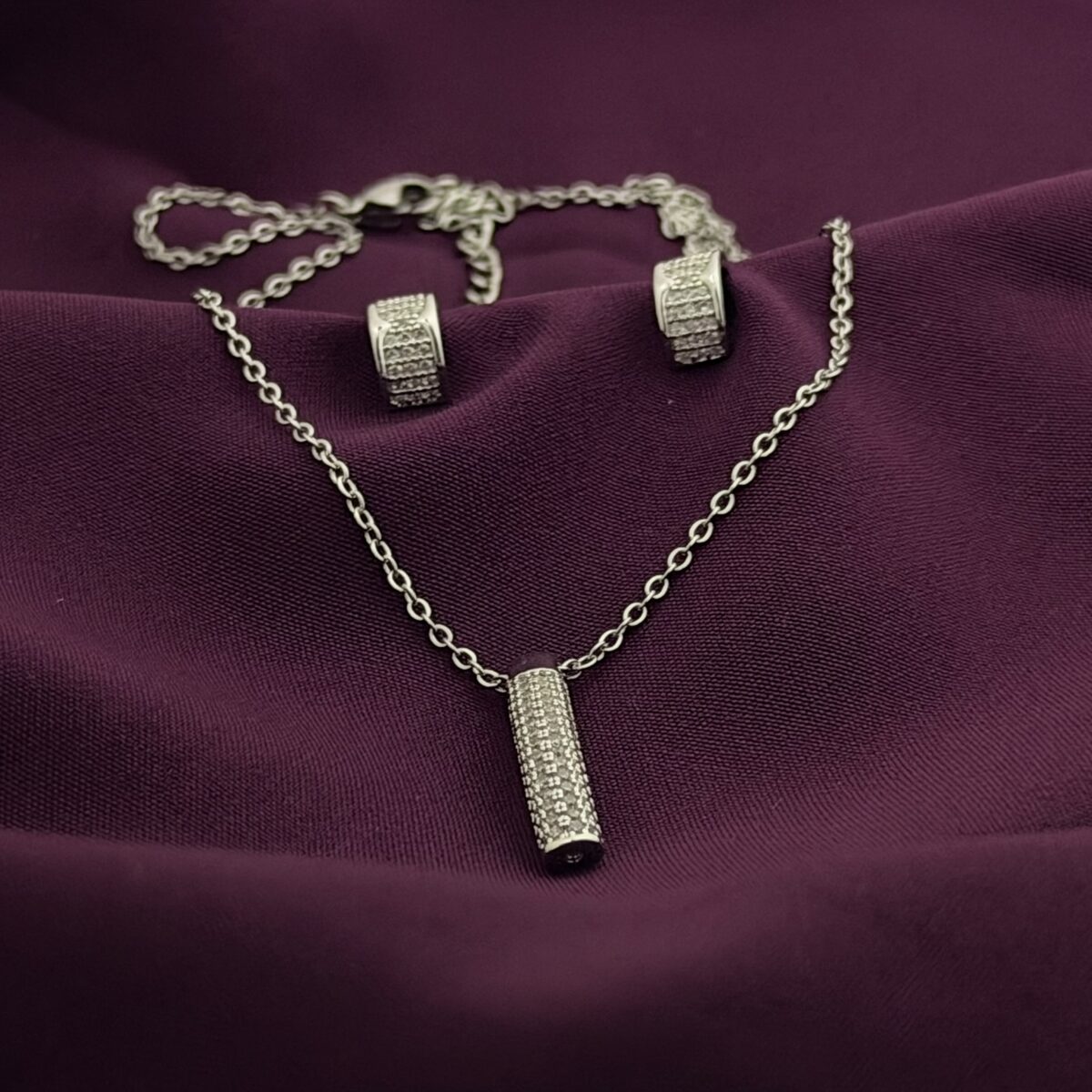 Silver Plated Rectangular CZ Stone Pendant Necklace Set with Matching Stud Earrings