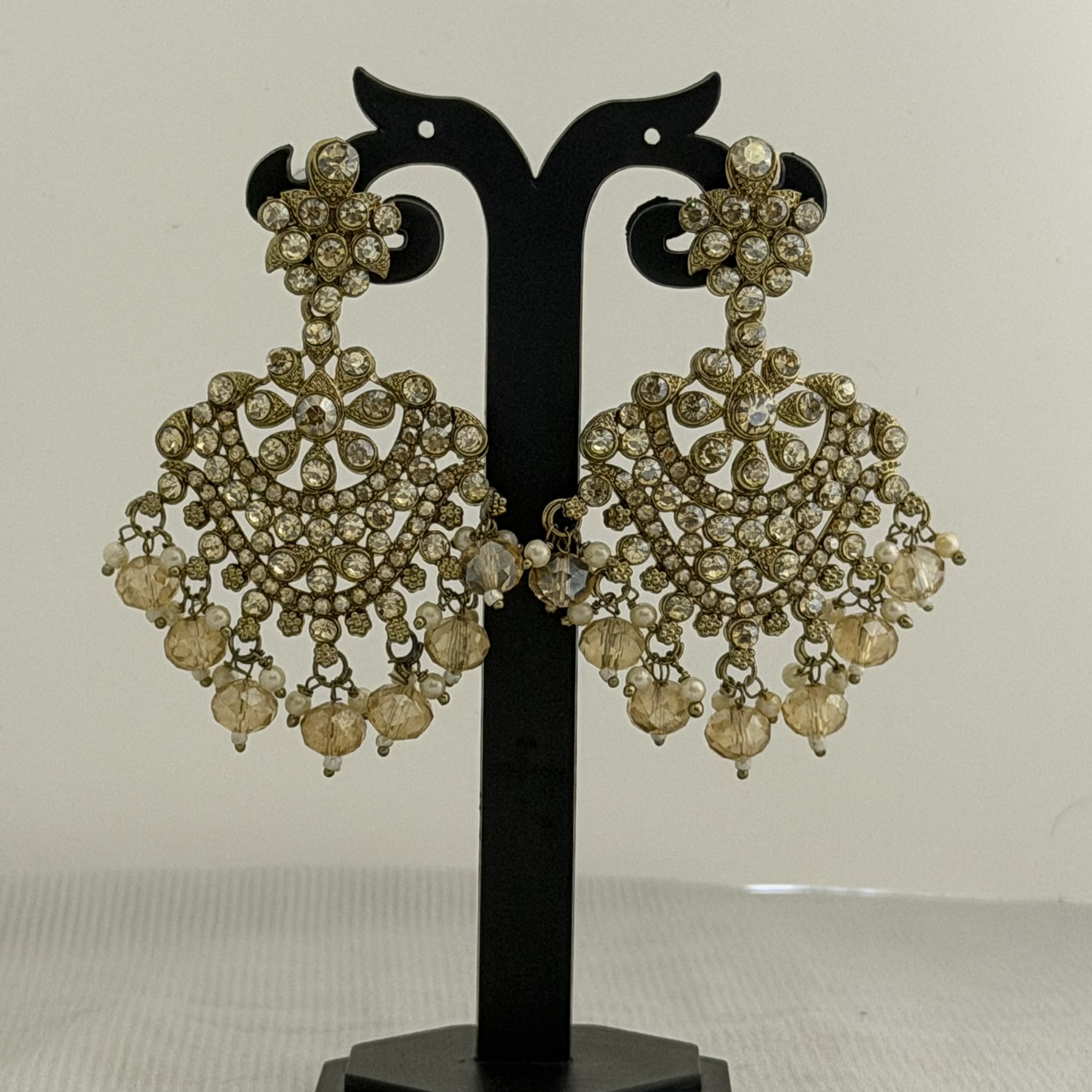 Elevate your ethnic look with these stunning chandbali-style statement earrings crafted in an antique gold finish. The intricate filigree base is densely set with sparkling American diamond (white zircon) stones, creating a rich vintage aesthetic. Cascading from the base are multiple champagne-toned faceted crystal beads and faux pearl drops, adding graceful movement and texture. Ideal for weddings, sangeet, festivals, and traditional occasions. Pairs beautifully with lehengas, sarees, and anarkalis in gold, beige, champagne, or ivory tones.
