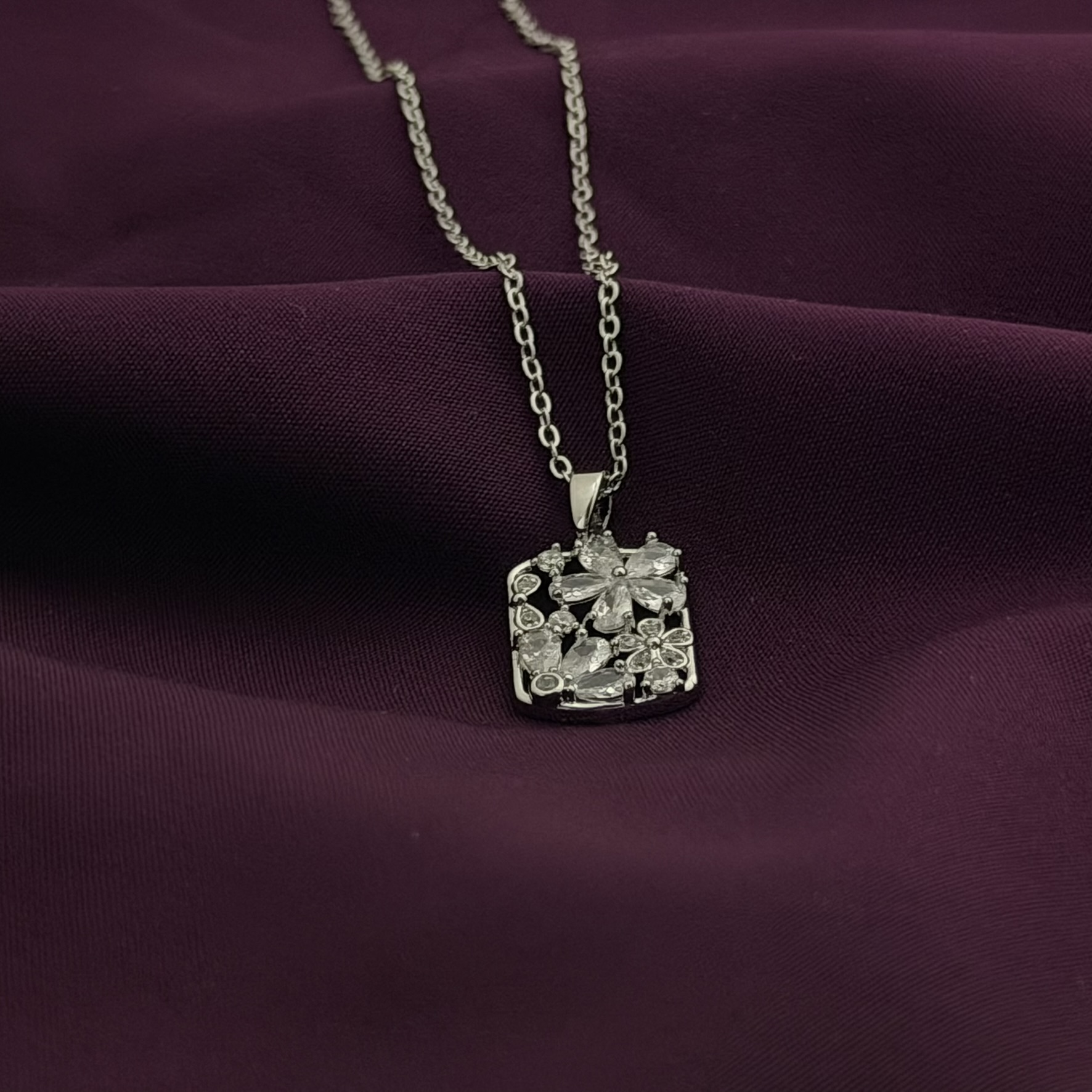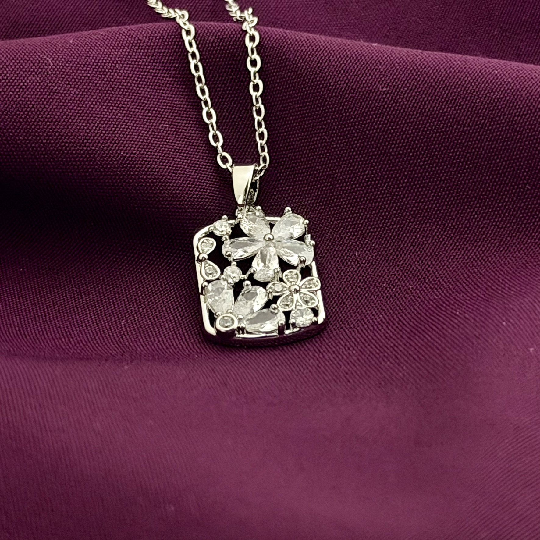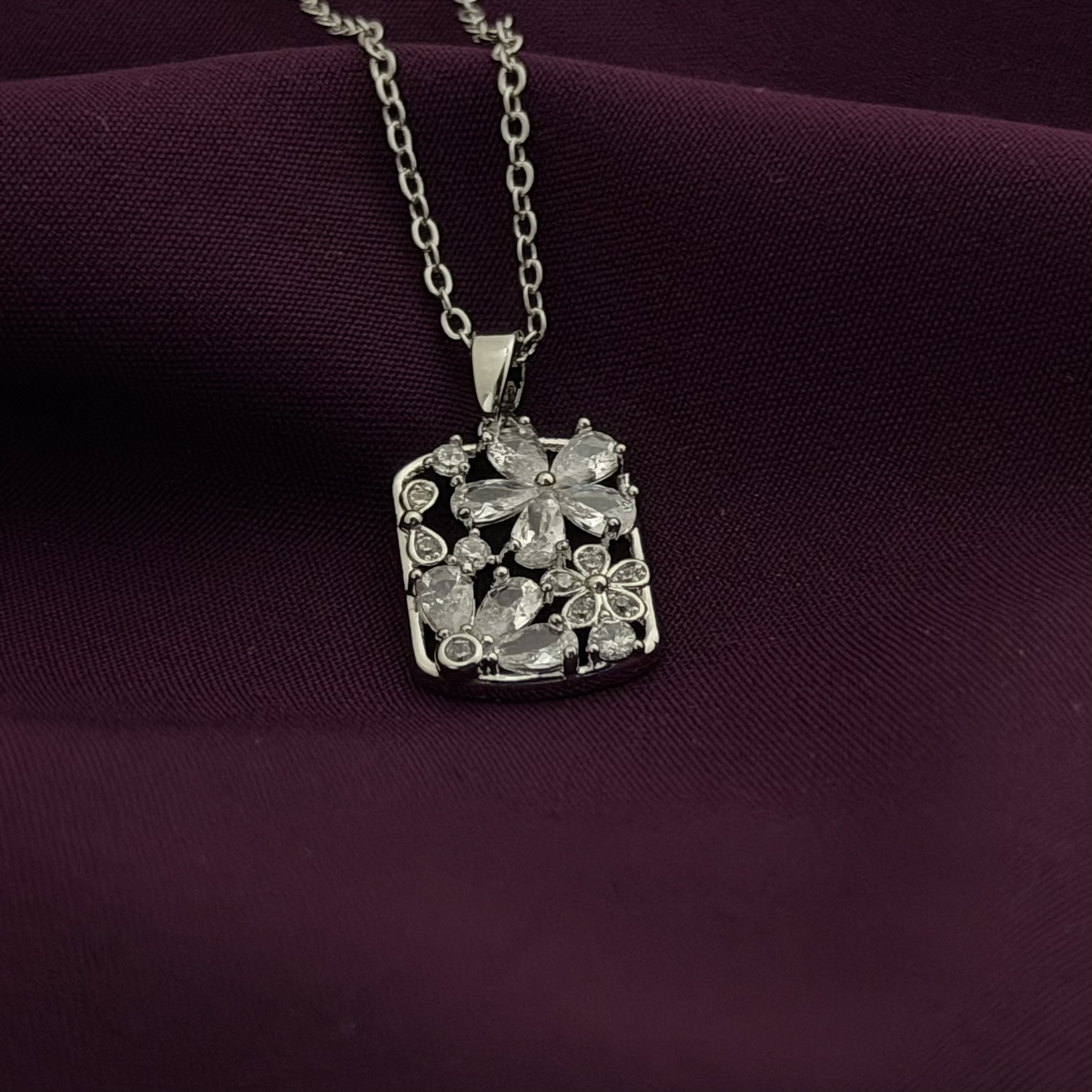This exquisite silver-plated necklace showcases a beautifully crafted square pendant adorned with multiple floral designs and glimmering American diamond (CZ) stones. The intricate detailing features delicate flowers arranged artistically, creating a garden-inspired aesthetic. The rhodium-coated silver finish ensures a lustrous, long-lasting shine that complements both traditional and contemporary styling. The pendant hangs gracefully from a sturdy silver chain, making it a versatile addition to your jewellery collection.